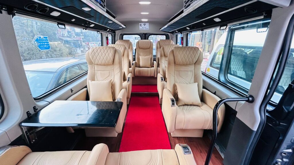 Depending on the model, our luxury vans for outstation tours can comfortably accommodate 10 to 15 passengers. They are designed to give extra legroom, luggage space, and premium comfort for both short and long journeys.
